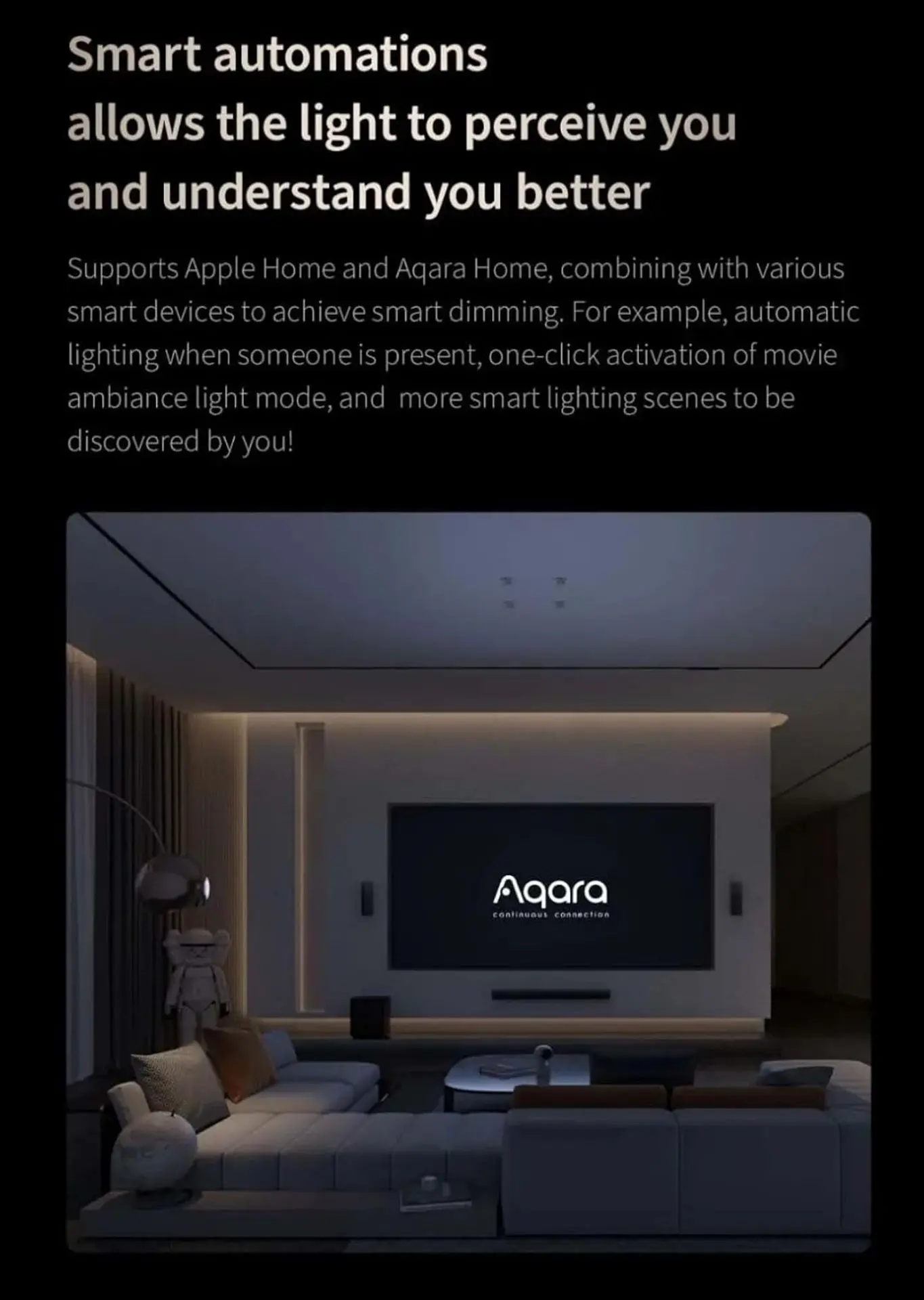 As part of your Aqara Smart Home, your smart light can also react to motion sensors, door sensors, time-of-day, geolocations, or as part of scenes. As an example, your light can dim on a Movie Time scene.