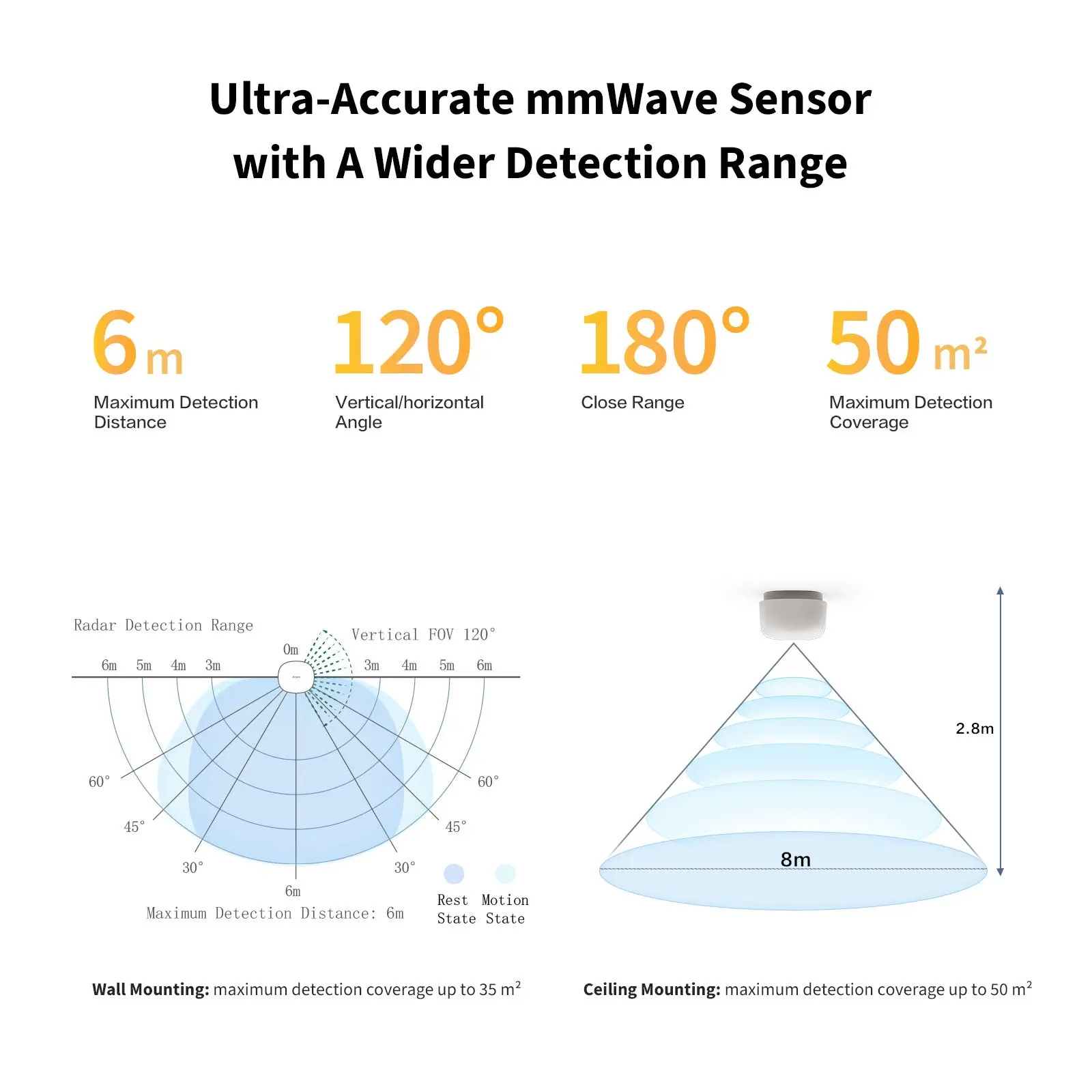 • Ultra-Accurate mmWave Radar Sensor: Equipped with advanced mmWave Radar technology, the FP1E surpasses traditional PIR sensors in sensitivity and speed, detecting subtle movements with a 200 ms response time. It offers a wide, adjustable 120° field of view, covering up to 50 m² for ceiling installations and 35 m² for side installations, ensuring comprehensive and adaptable monitoring for various home environments.